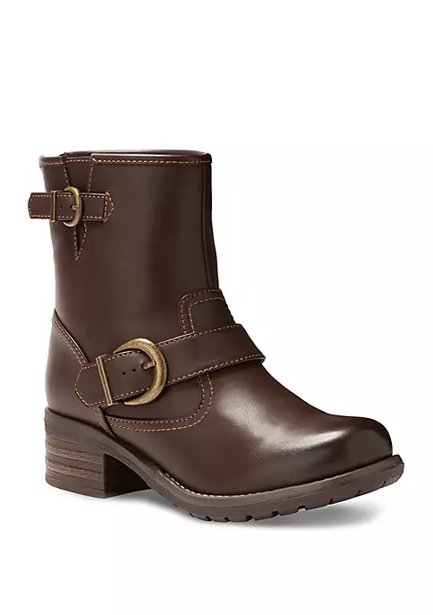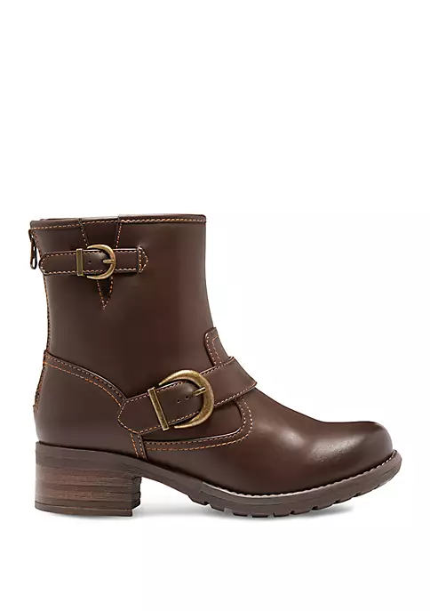 Add a dash of effortless edge to your wardrobe with the Ada strap and buckle boots by Eastland® that feature an adjustable double buckle detail. The fabric-lined synthetic upper conforms to your foot for a custom fit, while the fabric-lined memory foam comfort insole supports and conforms to the curves of your foot. A textured rubber outsole provides great slip-resistance, durability and shock-absorbing cushioning.