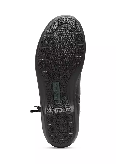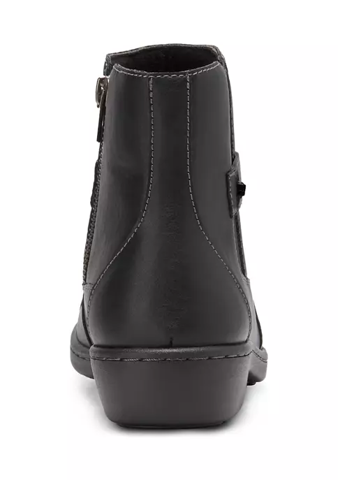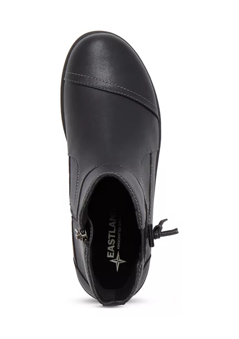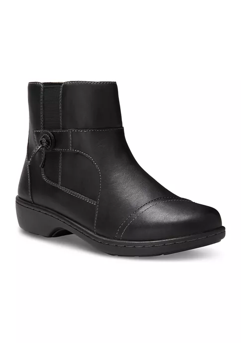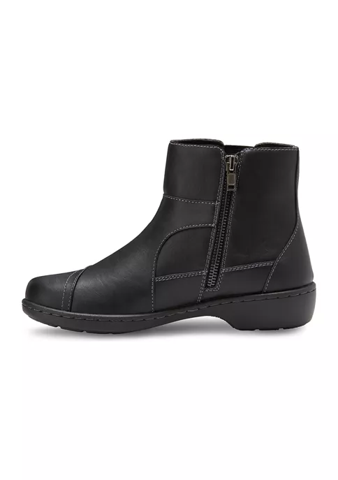 Slip into our Bella bootie and enjoy your day in casual comfort. Synthetic upper with fabric lining. Side zipper detail and elastic goring for easy on and off with a customized fit. A comfort insole supports and conforms to the curves of your foot. Shock absorbing Polyurethane outsole offers lightweight durability and traction.