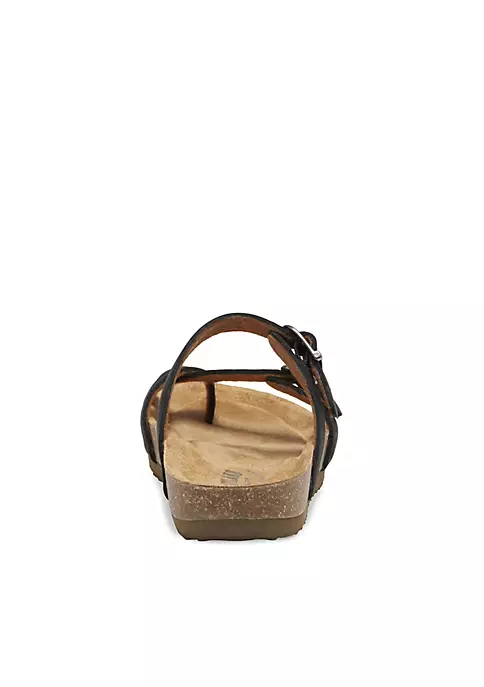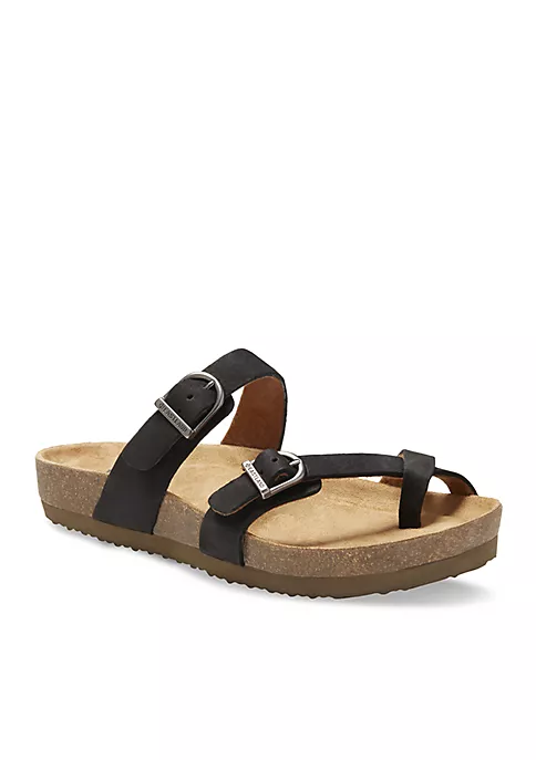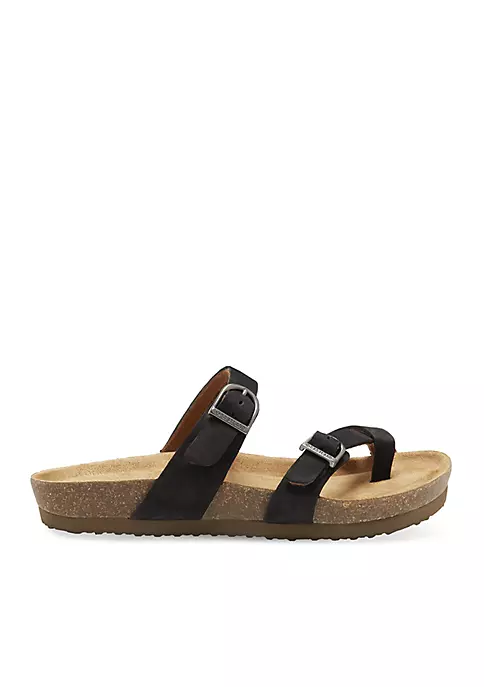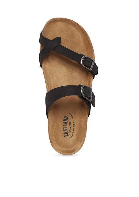 Enjoy easy-going style and comfort in the Brooke strappy slide sandal featuring a soft nubuck leather upper with a soft fabric lining for barefoot comfort. Adjustable straps and buckles provide a custom fit. Eastland® Exclusive Active Memory Foam comfort insole supports and conforms to the curves of your foot.