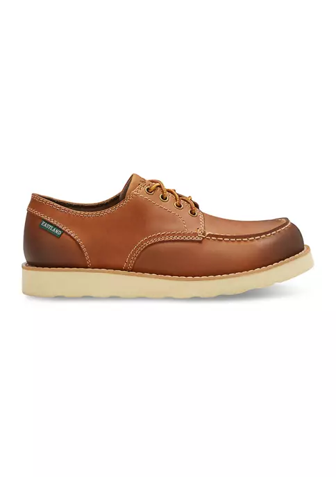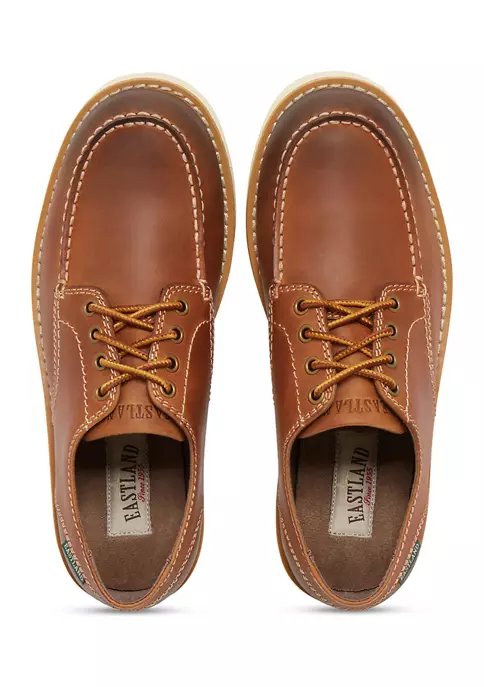 Lace-up moc-toe oxfords. Triple reinforced hand-stitching in heavy wear areas and aggressive storm welt for extended durability. Mini-groove sole design provides flexibility and all-day comfort. Reinforced, two-tone Taslan laces for easy on and off. Easy to care for smooth leather upper. Fully lined, cushioned insole and supportive shank reduce foot and leg fatigue.