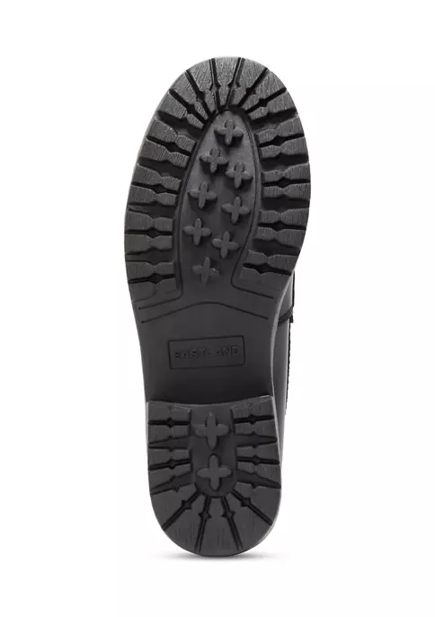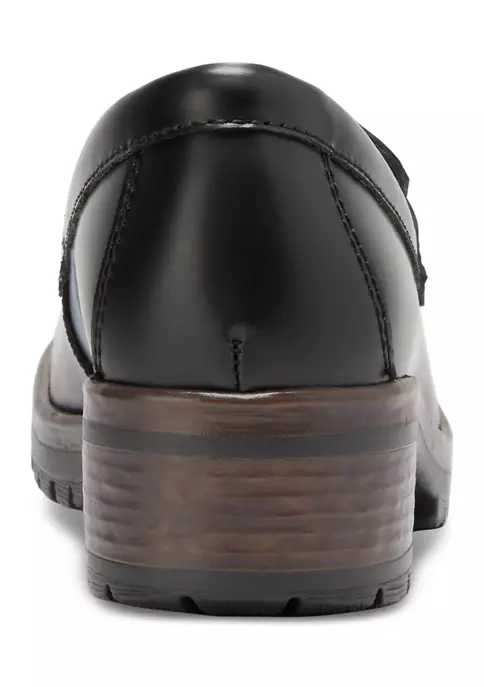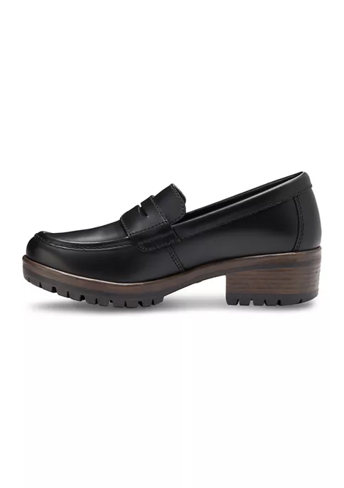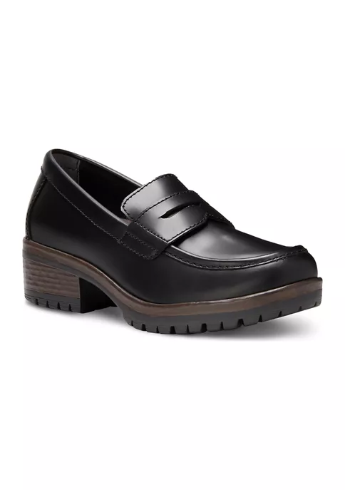 Penny loafer slip-ons. Smooth, polished leather upper offers no-fuss care. Eastland® Exclusive Active Memory Foam comfort insole supports and conforms to the curves of your foot. Flexible TPR rubber outsole for great comfort, slip resistance, insulation, and durability. Heel Height: 2.5 Inches.